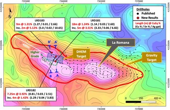 "These drill results from La Romana are very encouraging, confirming the near-surface Cu-Sn-Ag mineralization continues and is open to the west. Drillhole LRD181, with an intercept of 18m of 1.24% CuEq1, represents one of the best results so-far from the current 25-hole drill program targeting the western extension of the deposit. The new holes are 40-to-50 meters from the next nearest holes and highlight potential to extend the higher-grade copper mineralization with further step-outs. The La Romana mineralization now spans 1.5km east-west, and shows significant upside potential for further expansion," said Tim Moody, Pan Global's President & CEO.