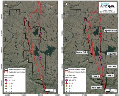 Figure 2: Local satellite view of the Muskox Project area showing the location of the Muskox Intrusion, SPC Nickel’s property position, 2024 grab samples color coded based on Ni+Cu wt.% grade and Pt+Pd+Au ppm grade. (CNW Group/SPC Nickel Corp.)