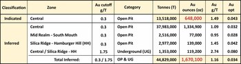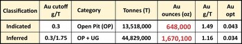 - The mineral resource is reported at a lower cut-off of 0.3 g/t Au for the conceptual open pit and 1.75 g/t Au for the conceptual underground extraction scenario. The lower cut-off grades and potential mining scenarios were calculated using the following parameters: mining cost = US$2.70/t (open pit); G&A = US$2.00/t; processing cost = US$15.00/t; recoveries = 92%, gold price = US$1,950.00/oz; royalties = 1%; and minimum mining widths = 1.5 metres (underground) in order to meet the requirement that the reported Mineral Resources show "reasonable prospects for eventual economic extraction".