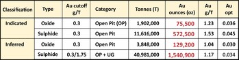 - Indicated Mineral Resource of 13.5 million tonnes at an average grade of 1.49 g/t Au for