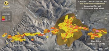 Figure 1: Fondaway Canyon Project MRE showing conceptual pits and gold grade block model