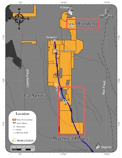 The Otú fault system ("Otú Fault") has a strike length of over 100 km, from Aris's Segovia-Remedios mines (TSX: ARIS) in the south to Nechi in the north, where it is buried beneath younger sedimentary overlap sequences. Soma's property holdings now cover more than 56 km of this strike length. High-grade gold mineralization occurs along the entire strike length of the Otú Fault, within brittle-ductile to brittle quartz veins that formed during later stages of deformation along the fault. Across the district, quartz veins display orientation patterns suggesting they formed in conjugate faults associated with brittle faulting along the Otú Fault. Notable mines along the Otú trend include Segovia-Remedios, La Aurora, El Limon, Le Ye, Los Mangos, and Cordero. The Machuca Property is located along a critical segment of this regional fault structure and contains numerous indicators of high-grade gold mineralization.