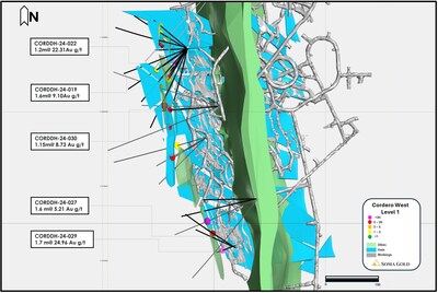 Figure 3: Location of Q2/Q3 high-grade gold composites along the strike of Cordero Level 1 Zone (CNW Group/Soma Gold Corp.)
