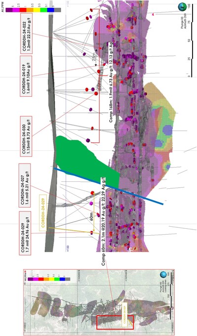 - CORDDH-24-029 1.7m at 25.0 g/t Au incl. 0.65m at 35.4 g/t Au and 0.4m at 41.6 g/t Au