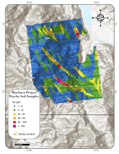 Figure 5: Reconnaissance soil grid on the Pysche 1 Target, Machuca Project (CNW Group/Soma Gold Corp.)