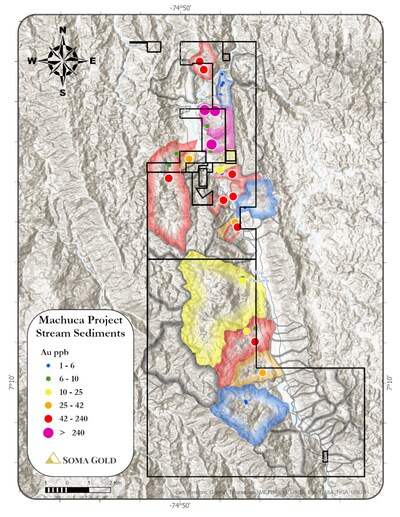 Figure 7: Stream sediment samples on the Machuca Project (CNW Group/Soma Gold Corp.) The Q2/Q3 2024 drilling to date continues to target the up-dip extension of the gold-bearing "Cordero Vein," focusing on delineating the southern extent of Level 1 (Figure 2). The Cordero Vein has been successfully mined from Level 2 to Level 6. Earlier attempts to develop above Level 2 were hindered by a cross-cutting mafic dyke. The Q2/Q3 drill program aimed to evaluate the western side of the dyke for a continuation of the Cordero Vein, a previously untested target.
