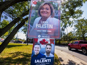 Posters for Liberal candidate Laura Palestini and Conservative candidate Louis Ialenti for the byelection in the LaSalle—Émard—Verdun riding in Montreal. In the end, the Bloc Québécois candidate won and the Liberals were left pointing fingers at each other over the loss. Photo by John Mahoney/Postmedia/File