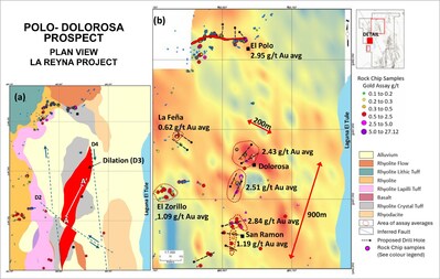 The El Polo-Dolorosa Target Area is an exciting exploration target located within an approximately 450-hectare area that is open in all directions, and host to numerous Prospects, including the El Polo and Dolorosa Prospects. The Target Area is underlain by altered and mineralized volcanic rocks located within a northeast trending dilation or jog created in a north-northwest shear zone and cross cut by northwest trending faults. The jog occurs in the area between the El Polo Prospect and the Laguna El Tule, which is a lake interpreted to follow a regional scale NNW trending fault. (See Figure 1a) The jog is host to extensive alteration, quartz veining, brecciation, disseminated sulphide minerals with associated gold (+/- copper). Exploration activities are focused on the bulk tonnage size potential identified in an altered and brecciated volcanic rock unit that is consistently mineralized in gold before dipping below cover.