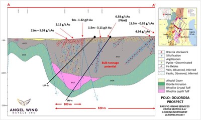 Figure 2: Cross Section A-A’ Looking Northwest Across the Dolorosa Prospect. Shows two proposed holes that will test beneath historic trench results of 5.03 g/t Au over 21 m. Magnetic Diorite, an important potential generator, outcrops sporadically and is interpreted to underly the target area. (CNW Group/Angel Wing Metals Inc.)