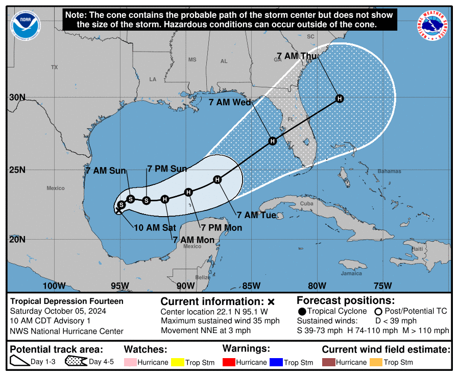 The initial advisory on newly formed #TD14 calls for it to become a strong category 2 hurricane with winds peaking near 110 mph with a landfall near Tampa, FL on Wednesday.