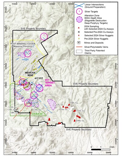 Figure 2 – Map of the Phoenix Silver property, showing main veins and targets. Target#1 (or 417 Target Area) encompasses the 417 lb silver fragment and multiple veins currently undergoing drilling. Targets south of the 417 area, include polymetallic veins as well as alteration zones potentially associated with porphyry-style mineralization.