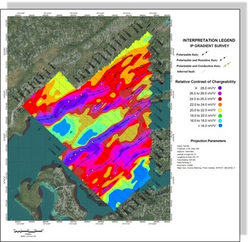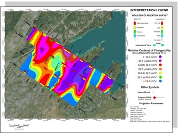 The chargeable anomalies identified, by the IP survey, in this grid appear to follow a continuous sub-tabular horizon that dips gently to the east. This layer may be indicative of a shallow sedimentary formation, such as an iron formation. Three anomalies, associated with the trends IPDM-4, IPDM-5, and IPDM-7, will require ground follow-up and trenching to better understand the geological nature of this horizon (see Figure 6).