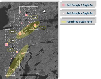 Four soil samples contained greater than 50 ppb Au (0.05 g/t), with values reaching up to 151 ppb Au. Two target areas, located along the trend of Golden Butterfly, were identified for follow-up exploration (see Figure 4). Although significant work has been carried out at Golden Butterfly, the northeast extension of the zone, which aligns with one of the identified target areas in a different iron formation, represents a new potential area and warrants further investigation.