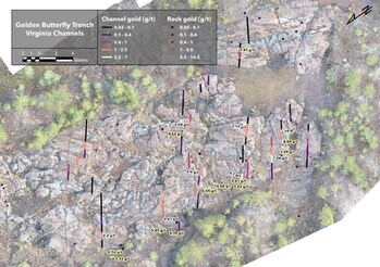 Figure 3: Gold results from channels and samples taken by Virginia Gold in 1994 from the Golden Butterfly outcrop (CNW Group/Comet Lithium Corporation)