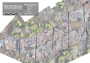 - Significant gold surface assay results, including 4.82 g/t gold over 4.5 metres in channel 10 at the Golden Butterfly showing.