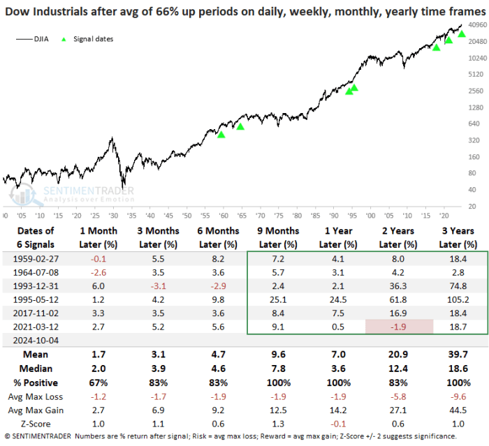 Goepfert noted that periods of extreme upside momentum have signaled exhaustion in the past for some sectors, such as utilities, but not for the Dow industrials. As shown by the chart below, at other times when the average of up periods across time frames topped 66%, losses were rare, with the Dow seeing particularly strong returns over the following nine-month periods.