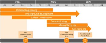 To-date, the Company has advanced approximately 752 metres of decline development and completed 623 metres of level development, for a total of 1,375 metres to-date, including metres advanced in the advanced exploration phase and prior to the start of the Phase 1 capital budget. The company remains focused on accelerating development rates by maintaining crews at full strength, with additional miners to fill unplanned contractor labour shortages. Efforts are also underway to reduce cycle times and ensure the operation of a reliable equipment fleet. The Company expects to complete approximately 1,200 metres of total development in Q4/24 and approximately 7,000 metres in 2025, which is expected to be sufficient to build the intended mill stockpile and ensure the required production stopes are accessible prior to scheduled production ramp up.