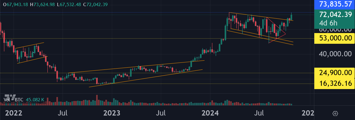 BTC has considerable resistance at the 74k ATH, obviously, but it's also obvious why hodlers would be excited here. That's a helluva bull flag.
