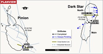 - Significant gold intercepts indicate strong potential to expand oxide gold mineralization beyond the projected open pit boundaries and extend the projected mine life at the Pinion and Dark Star deposits. Higher grade sulphide gold mineralization is also being encountered.