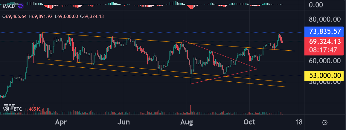 The lack of volume has at least two causes: the Tuesday election, and the all-time high just overhead at 74k-ish.