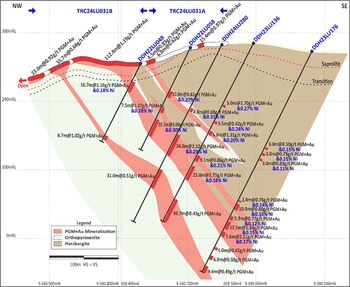 5m at 16.40g/t PGM+Au, and 42m at 2.41g/t PGM+Au, 0.12% Ni