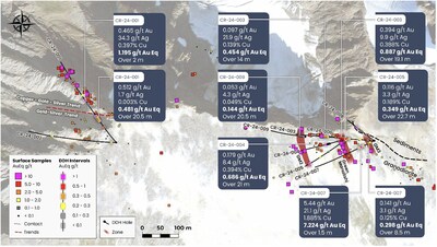 Holes CR-24-001 and CR-24-002 targeted the westernmost portion of the zone where metal zonation was suspected based on the surface sampling results (see Figure 1). The Company hypothesized that a gold-silver area was followed to the north by a copper-gold-silver one. Hole CR-24-001 appears to have straddled both zones, intersecting an interval of 0.51 g/t Au and 1.7 g/t Ag over 20.5 m between 124.2 and 144.7 m along the hole and a further interval of 0.47 g/t Au, 34.3 g/t Ag and 0.40 % Cu over 2.0 m between 239.3 and 241.3 m. Hole CR-24-002 intersected regularly mineralized veins, which appear to be part of the gold-silver trend.