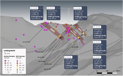 Hole CR-24-009 tested the western part of the same anomaly cluster and intersected 20.5 m at 0.05 g/t Au, 4.3 g/t Ag and 0.05% Cu, which correlate well with the location of the surface anomalies and are interpreted as the shallow expression of the GM2 zone.