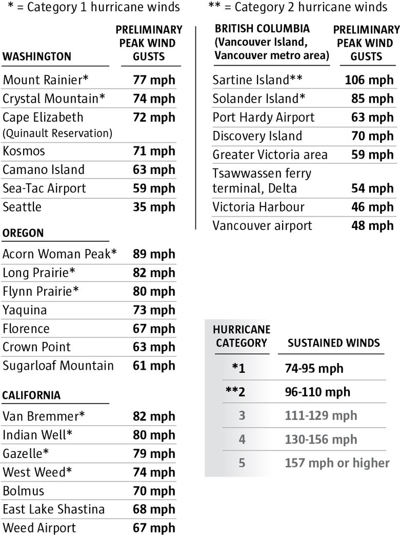 Preliminary data recorded between 6 a.m. Tuesday and 6 a.m. Wednesday during the West Coast’s bomb cyclone showed wind speeds of up to 77 mph in Washington.