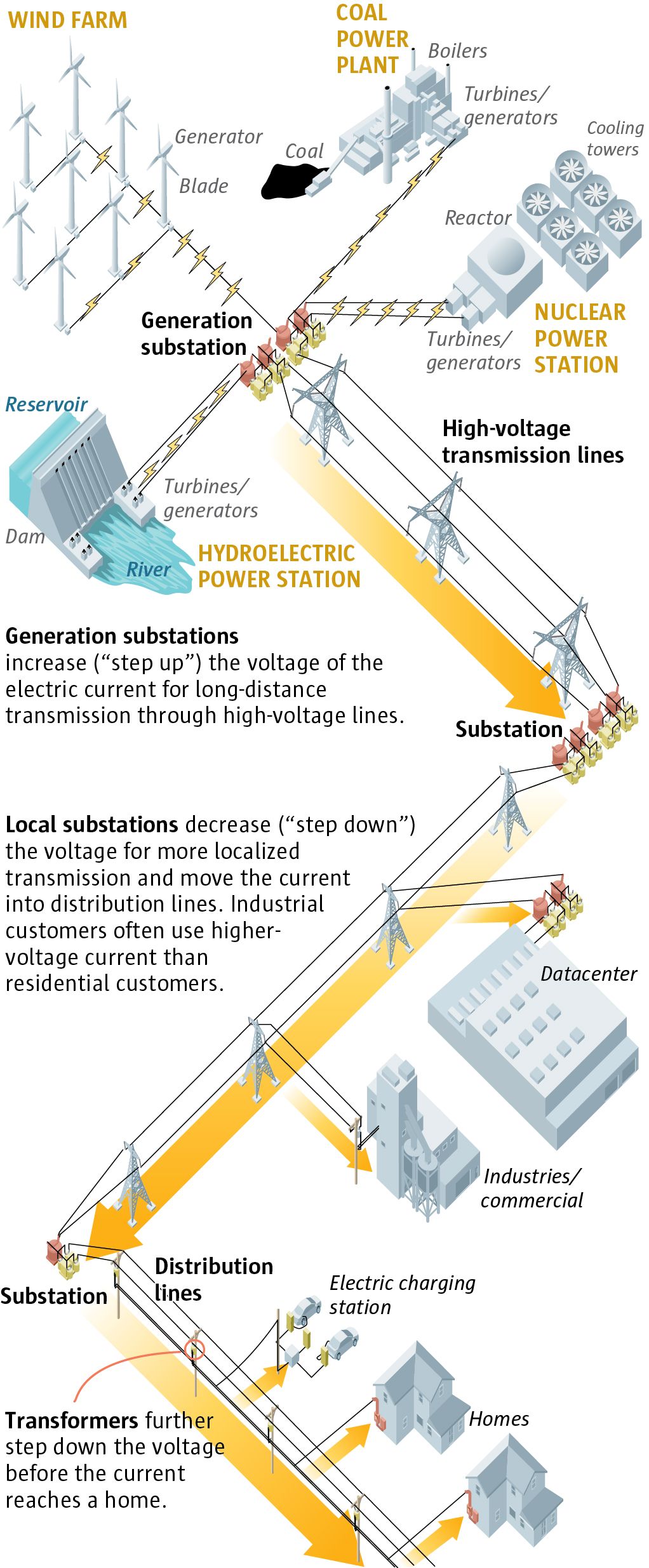 How electricity is transferred from power stations to businesses and homes