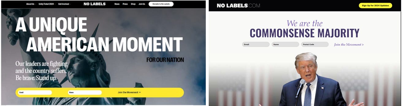 Key No Labels figures knew there was an organized effort to oppose their run, but didn’t start to learn how organized until filing the trademark lawsuit last December. The case seemed more like a matter of trolling than corruption at first. The actual No Labels website, located at nolabels.org, was suing an irksome imitator who’d bought and begun to use the domain nolabels.com. The mystery doppelganger used the same black banner, same font, same yellow oval signup button, even some of the same language, like the slogan “Commonsense Majority”: