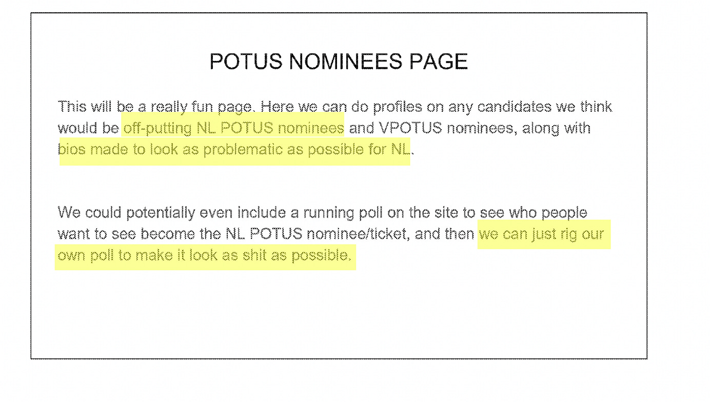 Pitchbook notwithstanding, the fake site ended up not pulling the 14/88 stunt. Nonetheless, the proposal was remarkable. A “Potus Nominees” slide proposed to have “fun” with a list of possible candidates by listing figures “we think would be off-putting,” complete with “bios made to look as problematic as possible.” Suggestions included a “running poll on the site to see who people want to see become the [No Labels] POTUS nominees,” but then “we can just right our own poll to make it look as shit as possible”:
