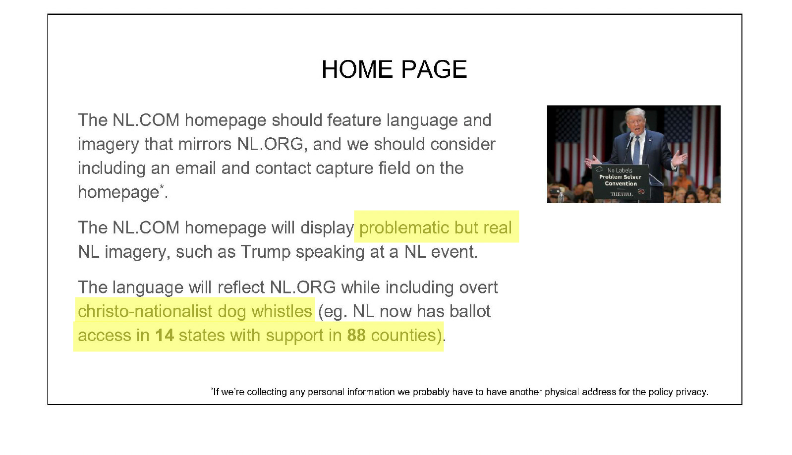 Makers of the fake site first proposed to make No Labels look like a Trump-supporting operation by including a picture of Trump speaking at a No Labels event in 2015. Worse, they pitched adding “christo-nationalist dog whistles,” like “NL now has access in 14 states with support in 88 counties.” The number 88 is code, paraded by Aryan prison gangs and people like mass shooter Dylann Roof alike, representing the eighth letter, H: HH, for “Heil Hitler.” The number 14 is a reference to a well-known “ 14 words” slogancoined by white supremacist David Lane: