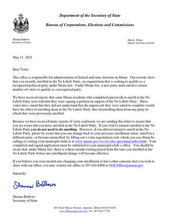 ARE YOU SURE? Letter by Maine Secretary of State Shauna Bellows to Maine residents who registered with No Labels The No Labels letter to the DOJ went unanswered, and from there, the effort ran into one problem after another. On January 16th Lieberman a letter to his old friend from the Senate days, Biden, asking him “respectfully… to help put an end to this shameful attempt to silence voters.” That letter too went unanswered. Two days later, news broke that American Bridge hired former Hillary Clinton attorney Marc Elias to help “thwart” third-party candidacies.