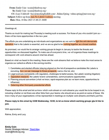 Former Emily’s List chief Emily Kane, now of Third Way, wrote a letter after the discussion reported on by Semafor, summing up the conclusions of what she called, in the subject line, the “Anti-No-Labels Coalition meeting.” Notably acknowledging they were indeed “working together as a broad coalition” to “fight the anti-democratic operation that is No Labels,” it added without irony that this fight for democracy should also include “deterring other third party presidential efforts.” Groups identifying themselves as “pro-democracy folks” saw no contradiction in an organized effort to prevent people other than their candidate from participating in elections.