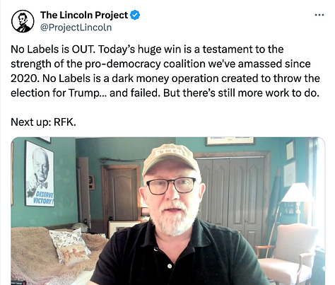 Right after that filing, on December 19th last year, Semafor published details of an 80-minute conference call between Democratic Party-aligned activist groups. Attendees included the aforementioned Mehlhorn, prominent neoconservative Bill Kristol, and representatives of Third Way, Move On, and “the Lincoln Project, American Bridge, Public Citizen, and Reproductive Freedom for All.” The piecesaid attendees agreed on an all-out strategy to stop the No Labels bid by sending the chilling message: