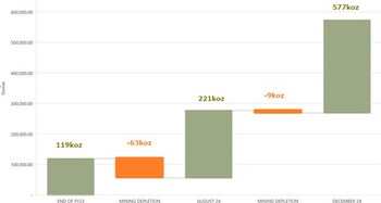 - 107% increase (+296koz) from the August 2024 Ore Reserve - post mining depletion, demonstrates value enhancement from drilling.