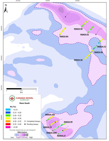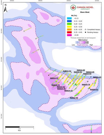 TORONTO, Dec. 11, 2024 /CNW/ - Canada Nickel Company Inc. ("Canada Nickel" or the "Company") (TSXV: CNC) (OTCQX: CNIKF) is pleased to announce additional successful results from its 2024 exploration program from three separate properties at Mann West, Mann Central, and Mann South.