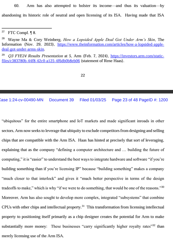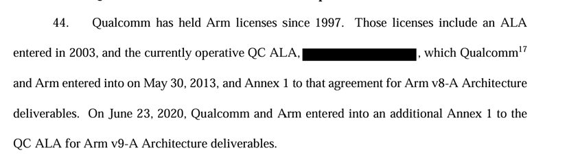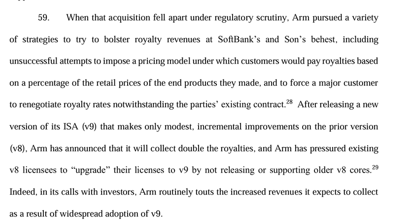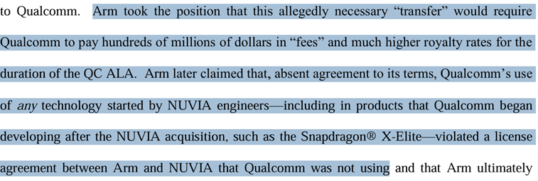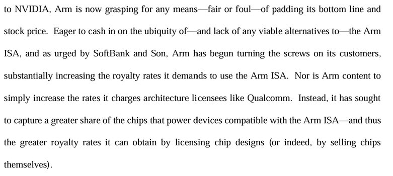 The main idea Qualcomm is trying to push in this counter suit is that after Softbank acquired Arm the relationship started to sour as Son attempted to realize gains of his purchase. This first started during the failed sale of Nvidia and then their eventual IPO. In order to drive more revenue into the company they needed to move from a QTL-esque company to essentially a Qualcomm. [QHT bias] Arm has been interfering with Qualcomm's ability to enter new markets, ship leading edge technologies by: