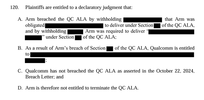 Oh yep here it is they're refusing to license v10 to Qualcomm, could the remedy for this lawsuit be monetary damages and a request that ARM be forced to license future versions to Qualcomm?