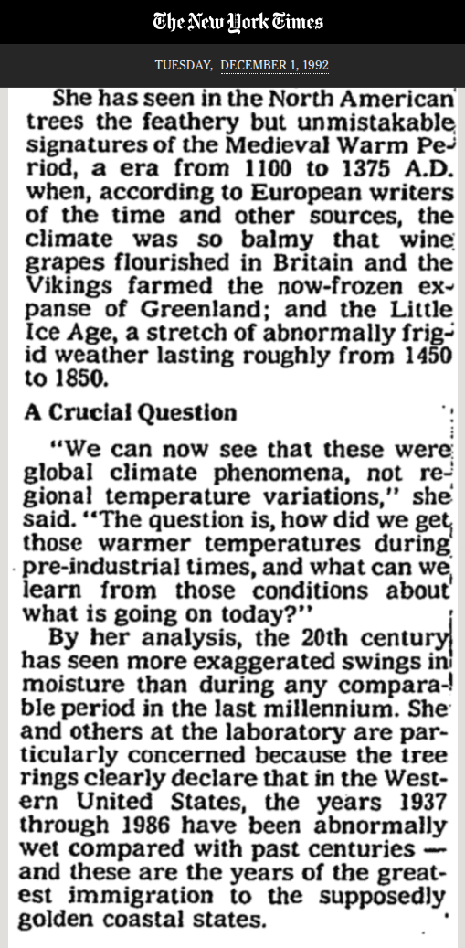 She has seen in the North American trees the feathery but unmistakable signatures of the Medieval Warm Period, a era from 1100 to 1375 A.D. when, according to European writers of the time and other sources, the climate was so balmy that wine grapes flourished in Britain and the Vikings farmed the now-frozen expanse of Greenland; and the Little Ice Age, a stretch of abnormally frigid weather lasting roughly from 1450 to 1850. A Crucial Question