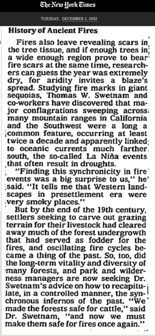But by the end of the 19th century, settlers seeking to carve out grazing terrain for their livestock had cleared away much of the forest undergrowth that had served as fodder for the fires, and oscillating fire cycles became a thing of the past. So, too, did the long-term vitality and diversity of many forests, and park and wilderness managers are now seeking Dr. Swetnam's advice on how to recapitulate, in a controlled manner, the synchronous infernos of the past. "We made the forests safe for cattle," said Dr. Swetnam, "and now we must make them safe for fires once again."