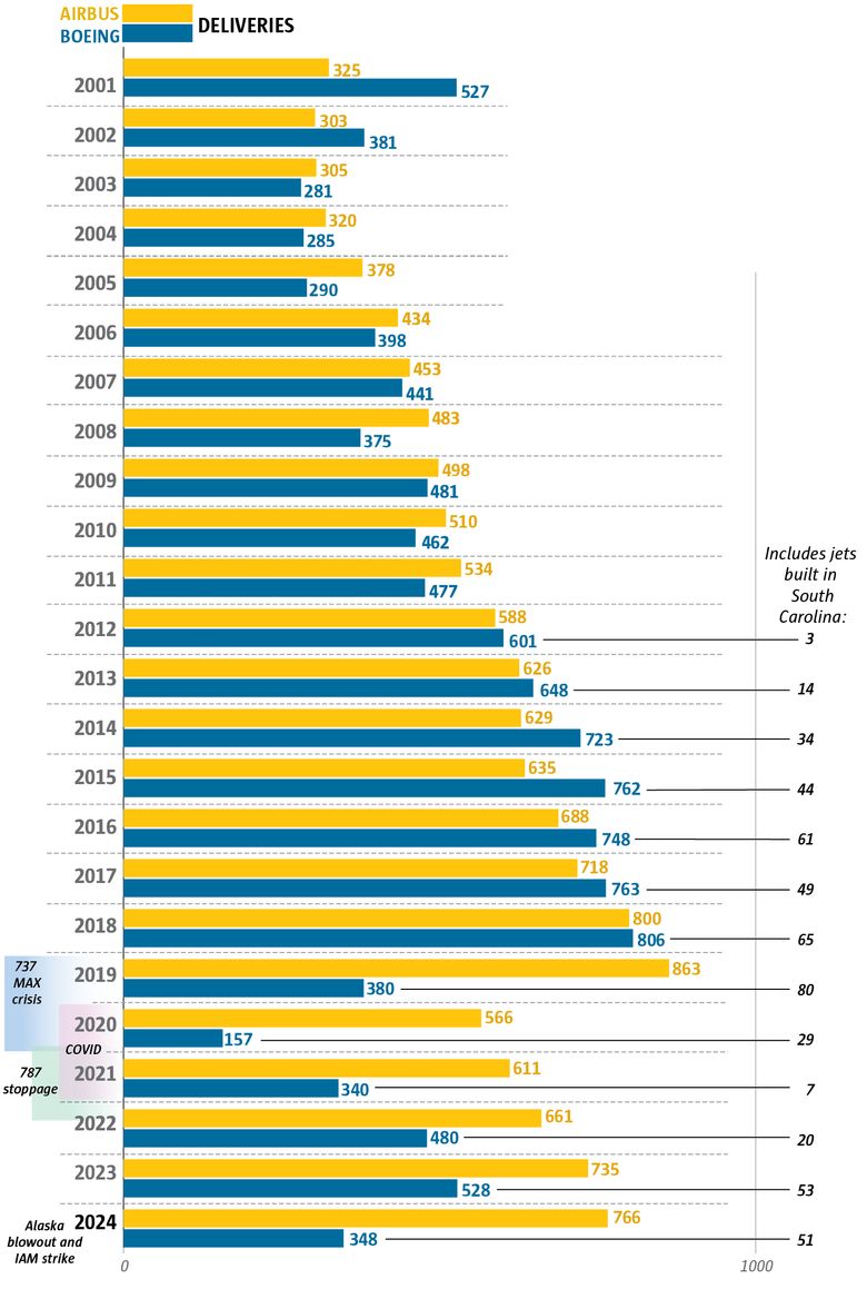 In 2024, with Boeing in crisis, Airbus dominated in both jet production and sales