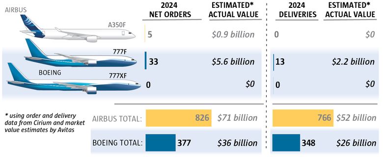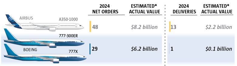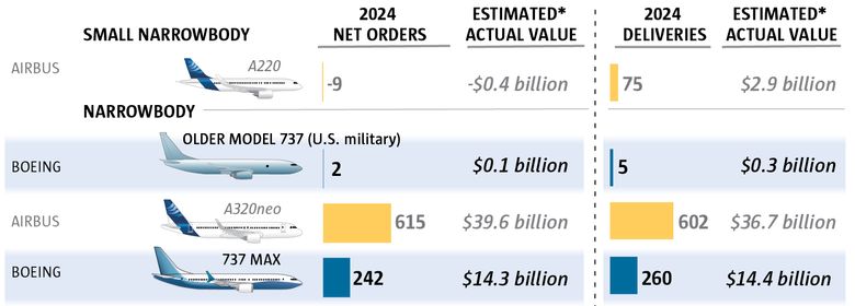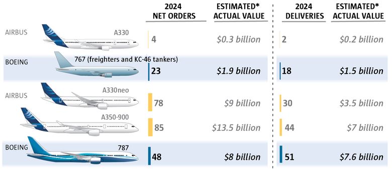 But even there, Airbus in 2024 delivered 89 widebodies, one more than Boeing. And Airbus won 220 net orders for widebody jets last year, while Boeing won 133.