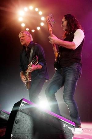But this was not at all a dampened experience. It simply was a fired-up, explosive, powerful performance. Fans picked up on the spirit in the intricacies of the music. Example: Lifeson's guitar work on the circuitous instrumental "YYZ" was just crunching. You can always count on Peart to blow your eardrums out, but during Saturday's show he kept tossing his drumsticks airborne, more than customary, catching them at the very moment it was time to bash the cymbals (these are moments Rush fans notice and relish, but which non-fans find totally incidental). Lee can still capture the high notes — the vocals coming out of Lifeson's blazing solo in "Freewill" are among the more amazing you'll experience in a live show. There were a couple of left-turn forays during such relics as "Closer To the Heart" and "Working Man" that might not have please orthodox Rush fans, but the band delighted in the jarring shifts in style.
