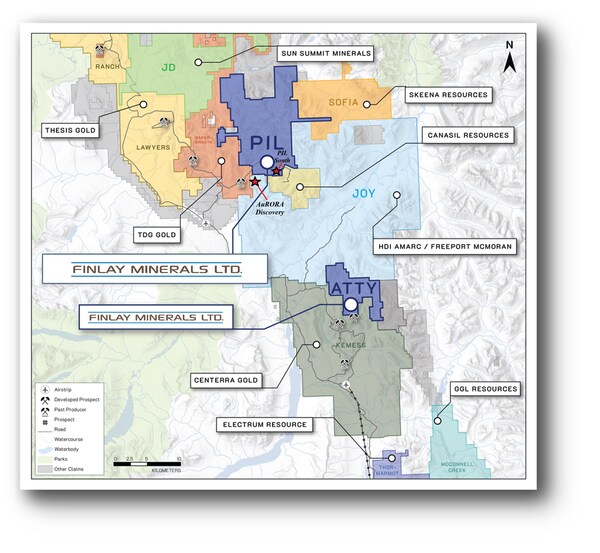 Finlay, additionally, congratulates AMARC Resources and Freeport-McMoran for the new high-grade "AuRORA" copper-gold-silver discovery on its Joy Property. The AuRORA discovery holes are approximately 750 metres ("m") from the PIL Property boundary and approximately 2,500 metres from the PIL South Target. Refer to the map included in this news release.