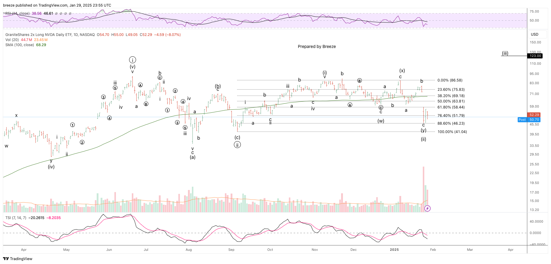 A_G and SD, here's a revised NVDL Wave Count Update. Wave (ii) retraced to the 88.6% level and I anticipated 61.8% retrace. The wave count did not invalidate. A continuation of this decline below 41.04 would do that. So if Wave (ii) is complete then Wave (iii) has a target (using a 168.2% extension). For now I won't consider an alternate wave count. Breeze