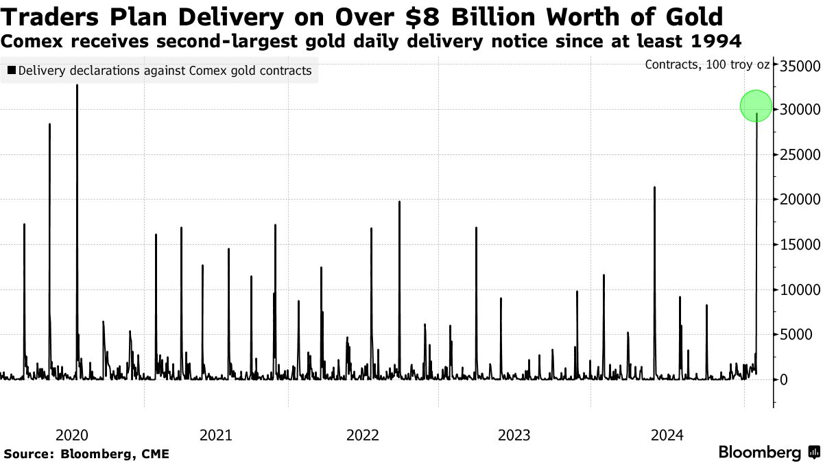 While millions of ounces of gold trade on Comex every day, typically only a small fraction of that goes to physical delivery, with most long positions being rolled over or closed out before they expire.