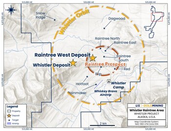 Figure 1 - Location map of the northern Project highlighting the Whistler and Raintree Deposits. Raintree Deposit lies within the broader Raintree Prospect area located approximately 1 kilometer east of the Whistler Deposit. (CNW Group/U.S. GoldMining Inc.)