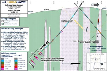 Tim Smith, Chief Executive Officer of U.S. GoldMining, commented: "This last drill hole in 2024 was designed to build on the successful season the Company had at the Whistler Deposit, which included the expansion of the western high-grade core at that deposit and returned results including 458 m at 0.75 g/t AuEq (see February 3, 2025 press release). For the final core hole drilled in 2024, we returned to the Raintree Prospect with the objective to drill test a very compelling exploration target, comprising a previously undrilled porphyry intrusion coupled with a large high intensity IP chargeability anomaly located 500 meters south of the existing Raintree Deposit. While the porphyry-style alteration and veining observed in the upper part of drill hole WH24-05 is encouraging for an early-stage drill prospect, the high-grade gold and silver in polymetallic veins intersected in the lower part of the drill hole significantly exceeded our expectations.