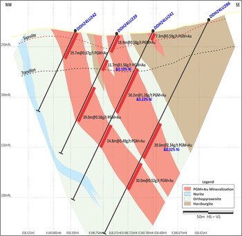 Highlights include 39m at 2.34g/t PGM+Au, 34m at 2.24g/t PGM+Au, and 36m at 2.21g/t PGM+Au